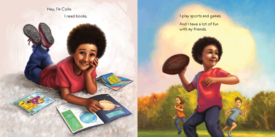 So he made sure that the books young Colin is reading on the first page represent a range of possibilities, with one about space, coding, plus a superhero comic. It was important that Mrs. Musa, the kindergarten teacher, be a Black woman with an African name, and that the best friend who steps in to support Colin is Black.